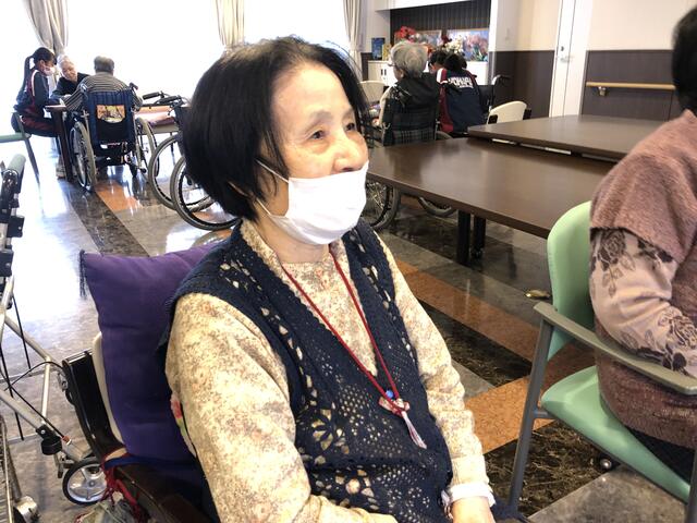 若い美男美女に囲まれて、入居者さまもダンディな微笑みです